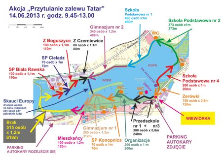 Załączona mapka pokazuje docelowe miejsca dla grup zorganizowanych oraz pozostałych mieszkańców i sympatyków. W razie wątpliwości należy zwracać się do koordynatorów akcji. Będą oni mieli identyfikatory z napisem organizator i żółte czapeczki