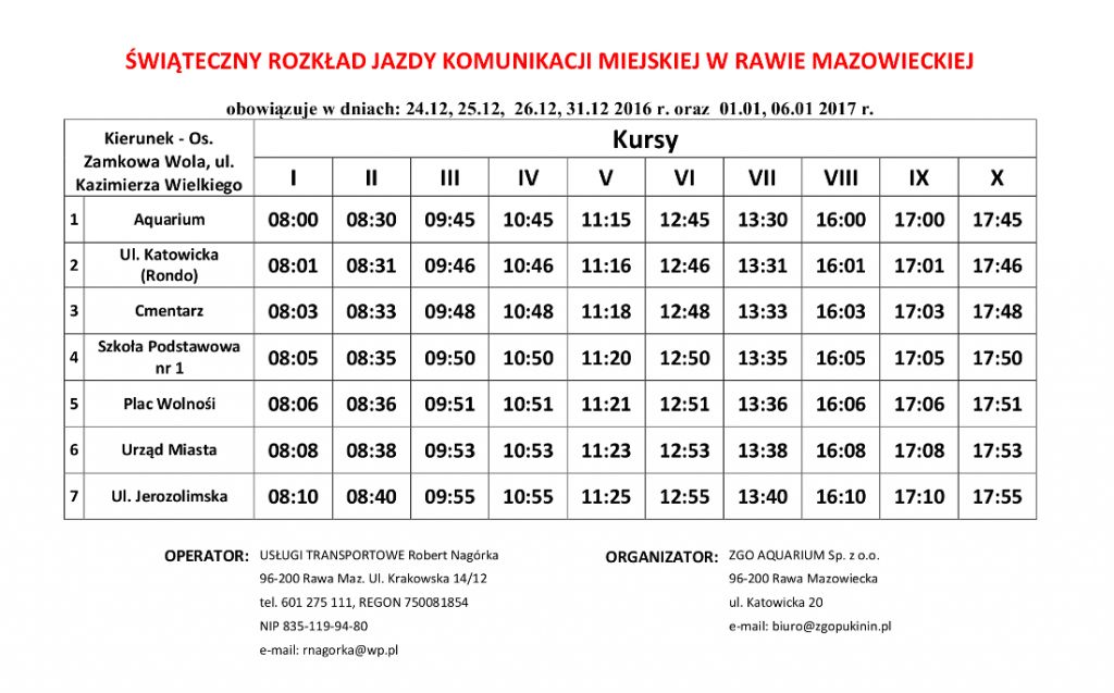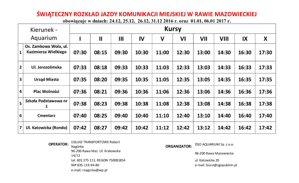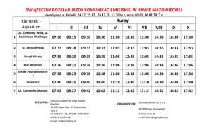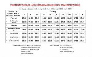 Informujemy Państwa, że w okresie świąteczno-noworocznym tj. w dniach 24, 25, 26 i 31 grudnia 2016 r. oraz w dniach 1 i 6 stycznia 2017 r. zostaje wprowadzony świąteczny rozkład jazdy rawskiej komunikacji miejskiej. Poza tym okresem obowiązuje normalny rozkład jazdy.