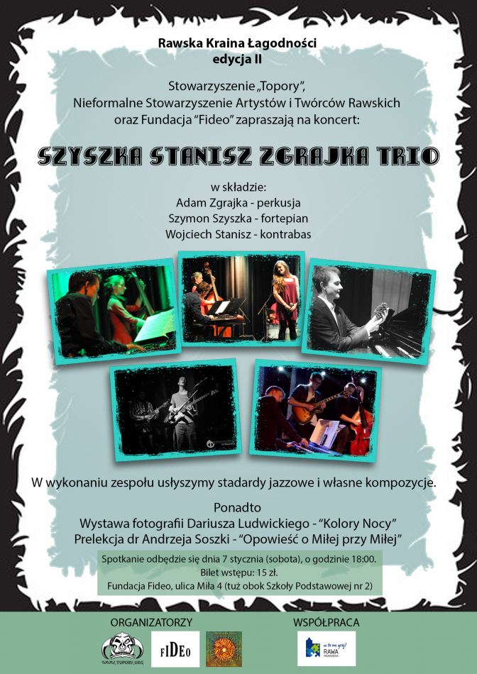 Zapraszamy na kolejny koncert z cyklu "Rawska Kraina Łagodności na Miłej". Organizatorami wydarzenia są: Stowarzyszenie „Topory” , Nieformalne Stowarzyszenie Artystów i Twórców Rawskich oraz Fundacja „Fideo”.
