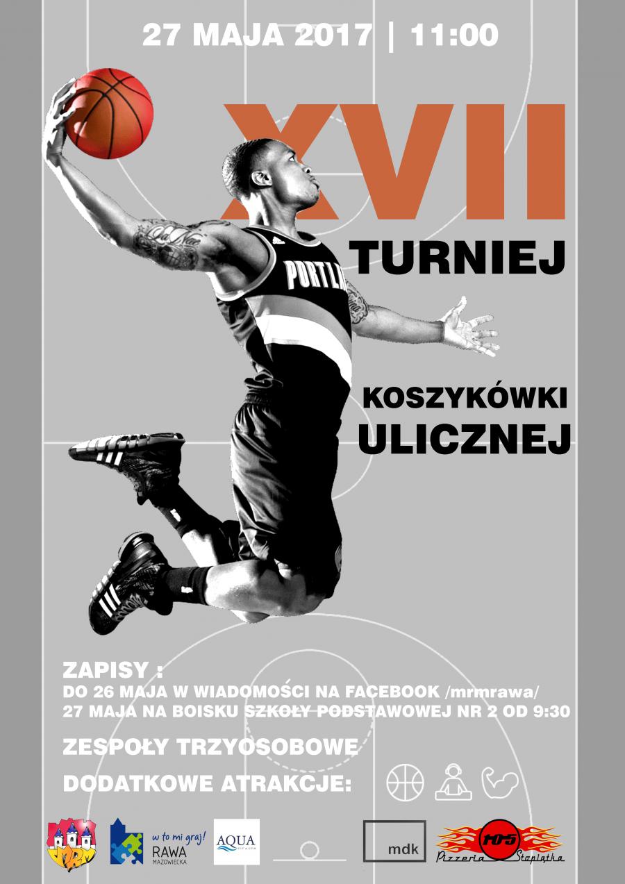 W sobotę 27 maja 2017 r. o godz. 11.00 Młodzieżowa Rada Miasta Rawa Mazowiecka zaprasza na 17. edycję Turnieju Koszykówki Ulicznej. Turniej odbędzie się na boisku Szkoły Podstawowej nr 2 (wjazd od ul. Targowej).