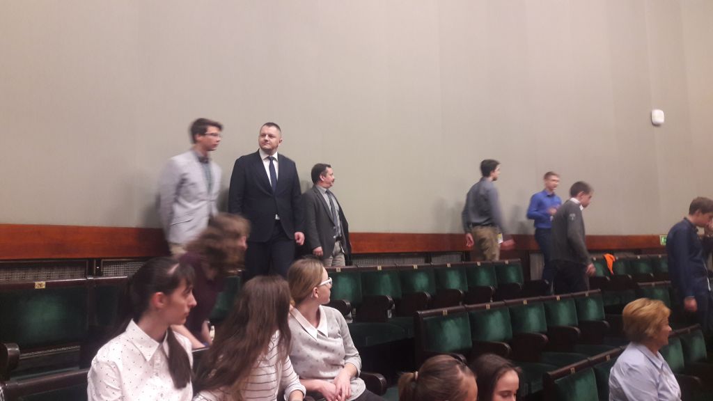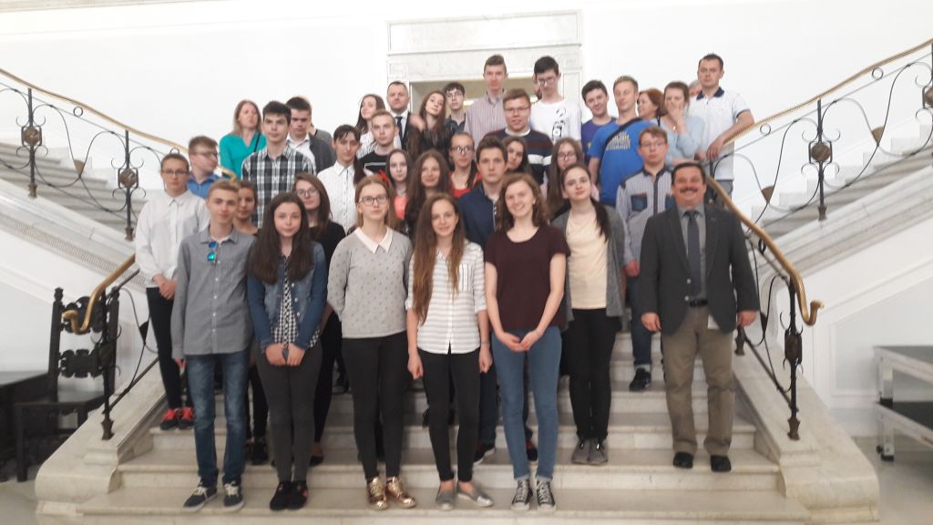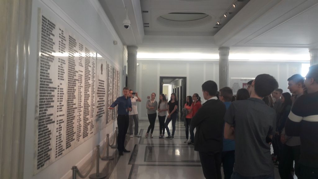 Kolejną atrakcją wycieczki był Parlament RP. W Sejmie młodzież przywitał Senator RP Rafał Ambrozik i specjalnie oddelegowany w tym dniu pracownik, który wprowadza w sejmowe korytarze. Każdy z młodych ludzi miał możliwość rozmowy z senatorem. Pan Senator podziękował młodzieży za udział w Konkursie Historycznym o Żołnierzach Wyklętych „Żołnierze Niezłomni”. A młodzież nie tylko pogłębiła swoją wiedzę, ale i odniosła korzyść biorąc udział w wyjątkowej wycieczce odwiedzając najważniejszą instytucję w kraju.