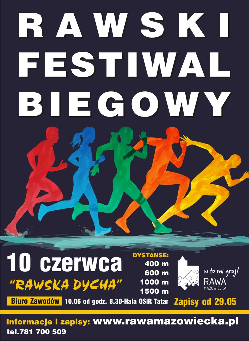Już 10 czerwca zapraszamy do udziału w imprezie sportowej Rawa Biega - Rawski Festiwal Biegowy. W tym roku przygotowaliśmy dystanse biegowe absolutnie dla wszystkich lubiących spędzać aktywnie czas na świeżym powietrzu. Rozpoczniemy biegiem dla najmłodszych na dystansie 400 m. Kolejne dystanse to 600, 1000 i 1500 m. Na zakończenie imprezy oczywiście Rawska Dycha czyli bieg na dystansie 10 km. Na wszystkich dystansach prowadzona będzie oddzielna klasyfikacja dla dziewcząt i chłopców, kobiet i mężczyzn. Przygotujemy atrakcyjne nagrody dla zwycięzców. Uczestnicy Rawskiej Dychy otrzymają specjalnie zaprojektowane pamiątkowe medale. Zapisy do biegów w formie elektronicznej pod linkiem http://zapisy.sts-timing.pl/182/ do dnia 08.06. do godz. 24.00. Zapisy dla młodzieży w szkołach u nauczycieli w-f. W dniu imprezy zapisy będą prowadzone w godzinach pracy biura zawodów (hala sportowa OSiR Tatar). Szczegółowe informacje w regulaminie i pod numerem telefonu 781. 700 509.