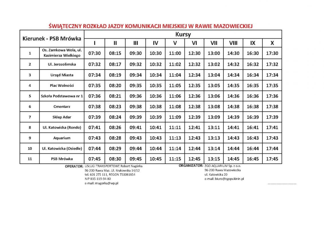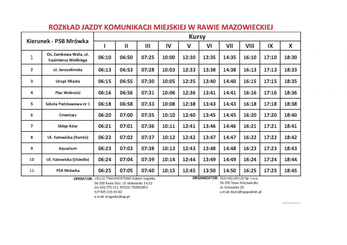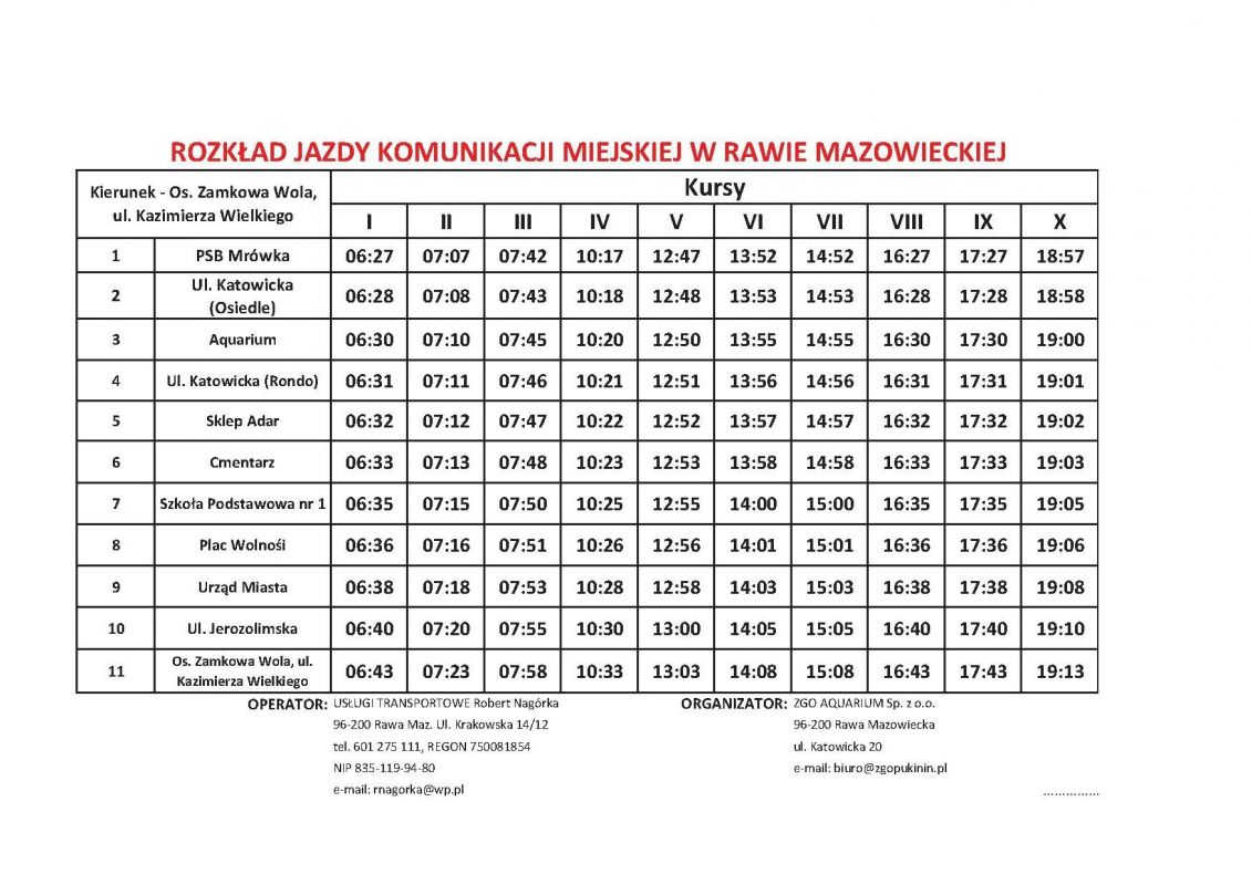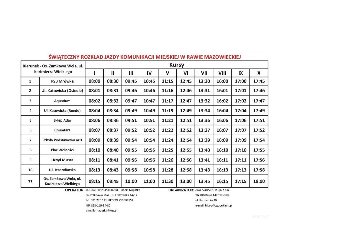 Informujemy wszystkich mieszkańców, że podczas Dni Rawy Mazowieckiej, tj. w dniach 27 i 28 maja 2017 r. zostaną uruchomiane dodatkowe przejazdy komunikacji miejskiej. Dodatkowe kursy obejmują dojazdy na trasie między Urzędem Miasta a Aquarium.