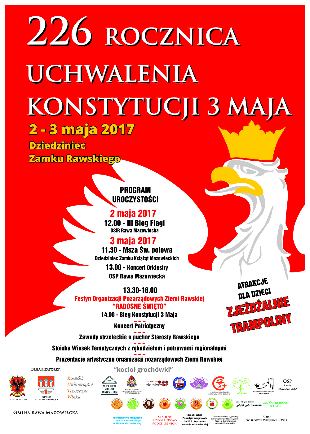 Burmistrz Rawy Mazowieckiej Dariusz Misztal serdecznie zaprasza wszystkich mieszkańców na uroczyste obchody 226. rocznicy uchwalenia Konstytucji 3 Maja. Oficjalne uroczystości rozpoczną się w środę 3 maja 2017 r. o godz. 11:30 Mszą św. polową na Dziedzińcu Zamku Książąt Mazowieckich. Uroczystości uświetni koncert Orkiestry OSP w Rawie Mazowieckiej oraz Kompania Honorowa z pocztem sztandarowym 7 dywizjonu lotniczego z Nowego Glinnika. Organizatorami obchodów są: Burmistrz Rawy Mazowieckiej, Starosta Rawski, Wójt Gminy Rawa Mazowiecka, ks. dziekan rawski.