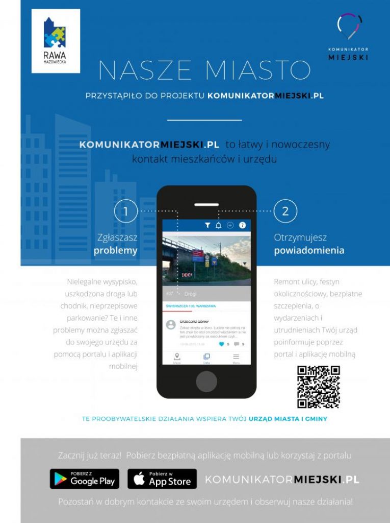 Rawa Mazowiecka dołącza do grona proobywatelskich miast i uruchamia bezpłatną aplikację mobilną Komunikator Miejski. Dzięki tej aplikacji mieszkańcy mogą łatwo i szybko powiadomić urzędników o problemie, jaki zauważyli w przestrzeni publicznej. System działa także w drugą stronę, na nasze urządzenie mobilne urząd będzie przesyłał ważne komunikaty.