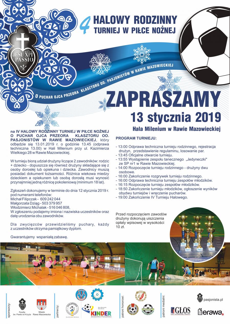 W dniu 13 stycznia, w godz. 13.00 – 19.00, na hali sportowej Milenium zostanie rozegrany IV halowy turniej piłki nożnej o Puchar Ojca Przeora OO. Pasjonistów w Rawie Mazowieckiej. W zawodach mogą wziąć udział dwuosobowe zespoły złożone z rodzica i dziecka. Rozgrywki zostaną przeprowadzone w trzech kategoriach wiekowych: do 10 lat, do 15 lat i powyżej 15 lat. Różnica wieku pomiędzy dzieckiem a rodzicem (opiekunem) musi wynosić co najmniej 18 lat. W turnieju może wziąć udział nieograniczona liczba drużyn.