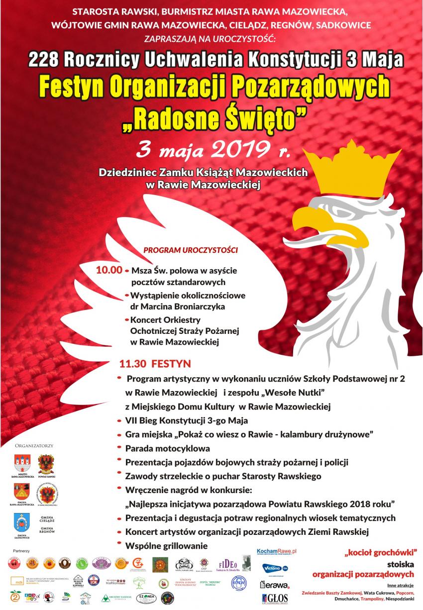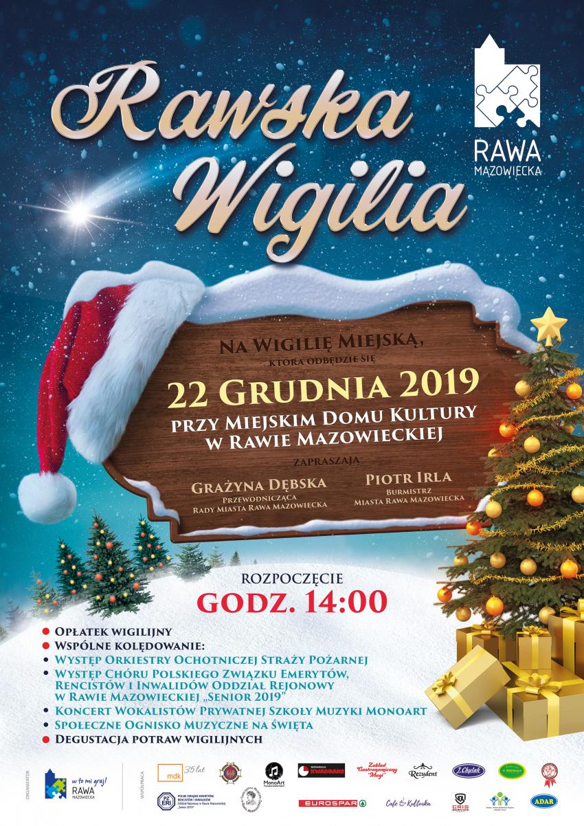 Jak nakazuje tradycja, na początek przełamiemy się opłatkiem i złożymy sobie świąteczne życzenia, a następnie będziemy mogli skosztować potraw wigilijnych serwowanych przez lokalnych restauratorów. Będzie również czas na wspólne kolędowanie. W programie: występ Orkiestry Ochotniczej Straży Pożarnej, występ Chóru Polskiego Związku Emerytów, Rencistów i Inwalidów Oddział Rejonowy w Rawie Mazowieckiej „Senior 2019”, koncert wokalistów Prywatnej Szkoły Muzyki MonoArt oraz występy uczniów Społecznego Ogniska Muzycznego.