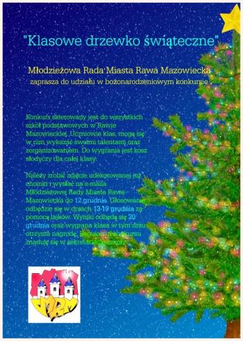 Młodzieżowa Rada Miasta zaprasza do udziału w facebookowym konkursie bożonarodzeniowym „Klasowe drzewko świąteczne". Konkurs skierowany jest do uczniów szkół podstawowych z terenu Rawy Mazowieckiej.