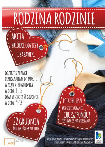 Zbiórka ubrań i zabawek będzie prowadzona 20 i 21 grudnia. Członkowie Rady ds. Rodziny będą oczekiwać na darczyńców w Miejskim Domu Kultury w piątek 20 grudnia w godz. 8-16 i w sobotę 21 grudnia w godz. 9-13. Dostarczone rzeczy będą wyeksponowane w holu MDK i potrzebujący będą mogli je odebrać w niedzielę, 22 grudnia, podczas Rawskiej Wigilii. Zarówno przekazujący jak i odbierający ubrania i zabawki robią to nieodpłatnie.