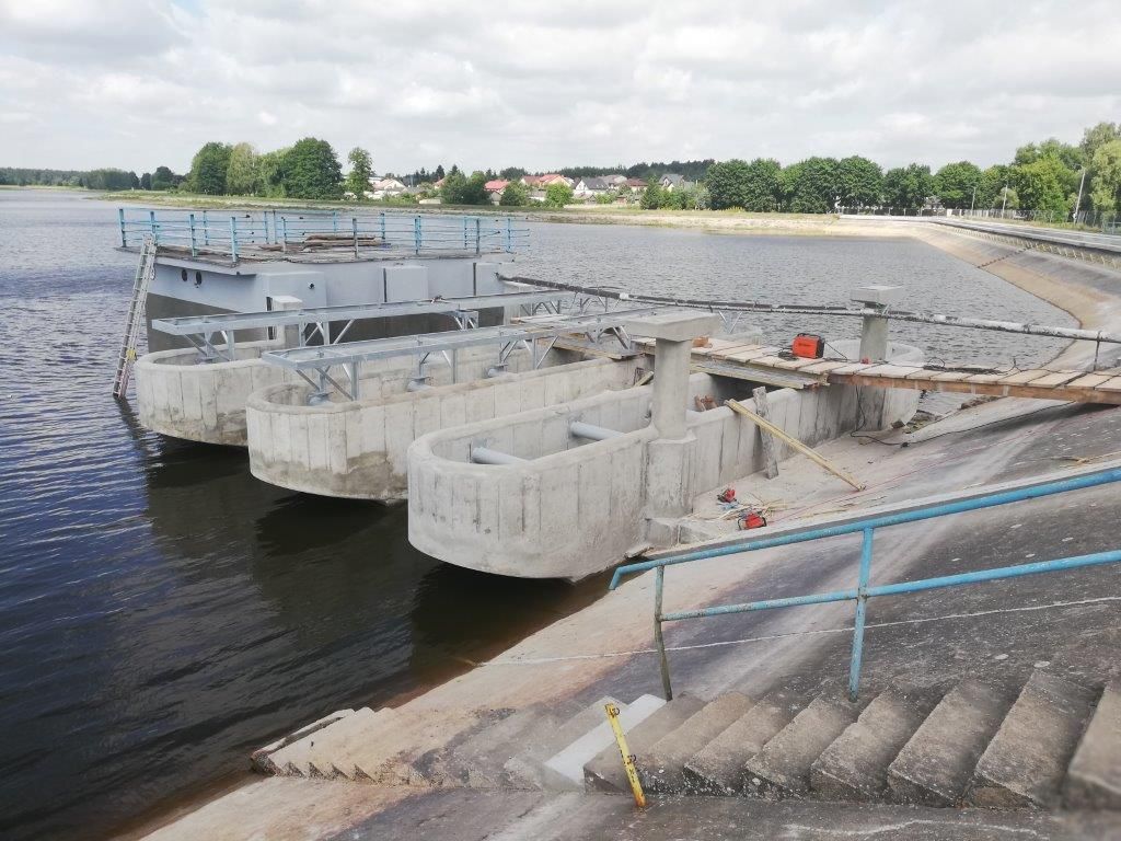 Obecnie trwają prace montażowe podestów do odladzania przelewów oraz montaż kładki łączącej zaporę ze studnią upustów dennych (Fot. nr 3 i 4 ). Przed oddaniem inwestycji do użytkowania zostaną wymienione balustrady usytuowane wzdłuż falochronu, na studni upustów oraz nad wlotem do MEW.