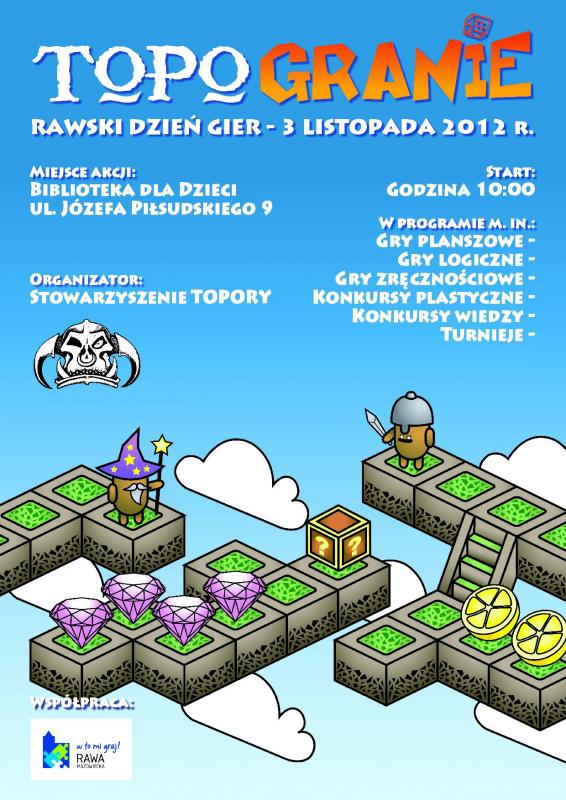 Stowarzyszenie Miłośników Gier Fabularnych i Fantastyki Topory zaprasza na kolejną edycję TOPOGRANIA, które odbędzie się w sobotę 3 listopada 2012 r. w Bibliotece Dziecięcej przy Pl. Piłsudskiego 9.